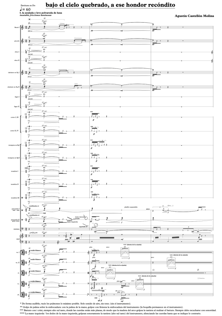 The work bajo el cielo quebrado, a ese hondor recóndito draws from the atmosphere and imagery of Los sonetos de la muerte by Gabriela Mistral. The poem evokes emotions and landscapes that find resonance within this composition: mourning, protective love, physical terrains laden with memory, the oscillation between suspension, tenderness, and abrupt outbursts, and a constant dialogue with the unreachable.