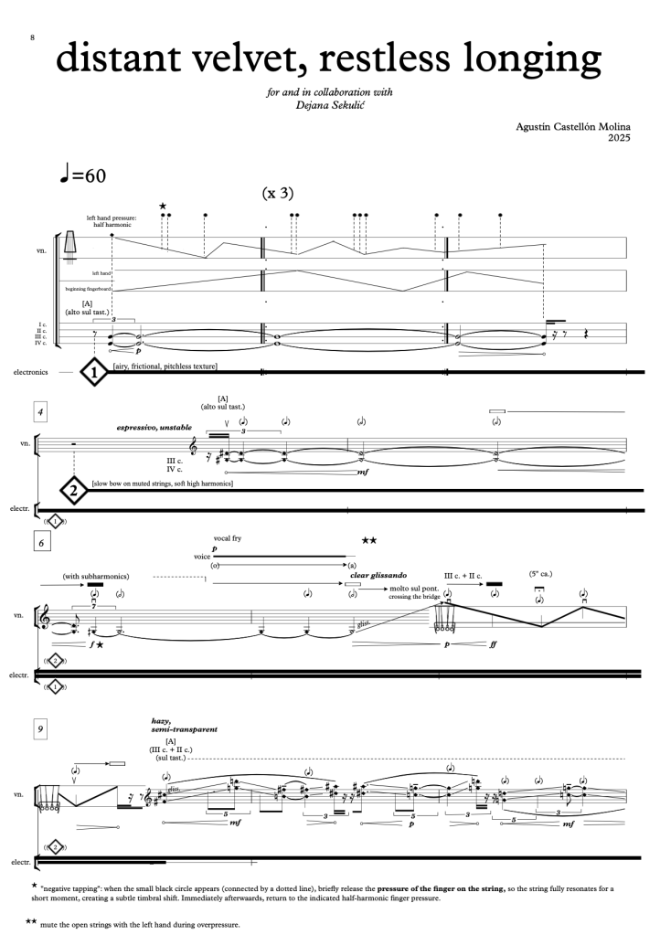 This work was born out of an exchange. The violin material of the composition was conceived as a reaction to an initial improvisation by Dejana, while Dejana’s improvisation (and the material for the electronic part) reacts to the text written by the composer, which inspired the process. In this sense, the compositional process is a “chain” of emotional reactions, and the written score has no definite origin, blurred, like a distant memory. “distant velvet, restless longing” is a suspended tension between presence and distance, and between what is heard and what is remembered.
