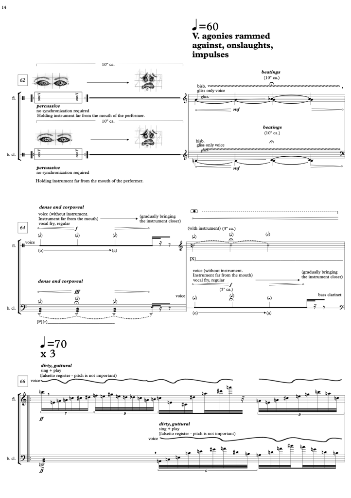 The narrative of the piece is that of a psychophysical memory made of fractures and fissures. It does not tell a linear story, but rather exposes a constellation of collisions, gestures, and resonances that intersect, overlap, fade, interrupt, and leave traces. Agonies that crash against each other, dense attacks, frictions, distant laments, and rips that produce striations coexist with oneiric-poetic atmospheres—arctic winds and crystalline stalactites—suggesting a kind of escapism within the violence of an unprocessed reality.